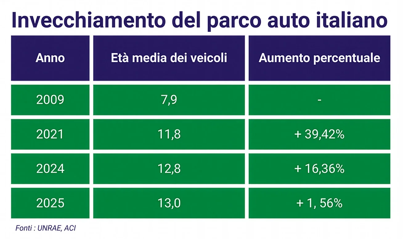 In Italia l’invecchiamento del parco automobilistico è una dinamica ormai evidente. Secondo l’ultimo annuario statistico dell’Automobile Club d’Italia, a inizio 2025 l’età media dei veicoli ha raggiunto 13 anni, segnando un aumento di due mesi rispetto all’anno precedente. Se si confrontano questi dati con quelli storici dell’UNRAE, il quadro è ancora più chiaro: rispetto al 2009, quando l’età media era di 7,9 anni, oggi abbiamo oltre 5 anni in più di utilizzo per ogni vettura.